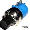 Multiturn 10 Turn 20k Potentiometer w Turn Counter Description, 20K ohm 10 Turn, 5% wirewound Linear taper potentiometer, round 1/4" shaft, includes nut and washer. body: 7/8" dia. x 3/4" L , overall length with shaft 1-17/32" Turn counter: reads up to 15 turns, brake lock, receives round 1/4" shaft, attaches to shaft with a set screw. 7/8" x 15/16" Assembly demensions: 1-3/4" to 1-7/8 overall length, maximum dia 1-1/16" including solder terminals and brake lever.